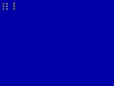 var video_mode = 7; // 800x600 pixels var screen_color[3] = 150,0,0; // dark blue var a = 20; var b = 5; var c = 0;