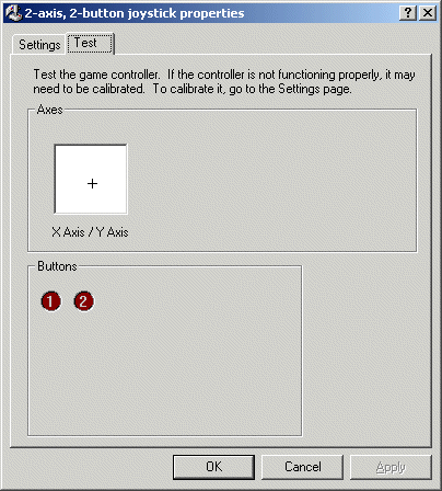 You can see my good old trusty joystick reported as being "OK". Click "Add" to add your joystick if you've never done that before. The installation should be easy and most joysticks will work ok with the drivers that come with Windows. Wait for the installation to finish, click "Properties" and then "Test" and you will see the following window: