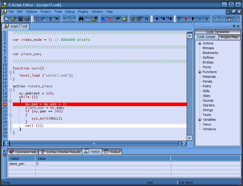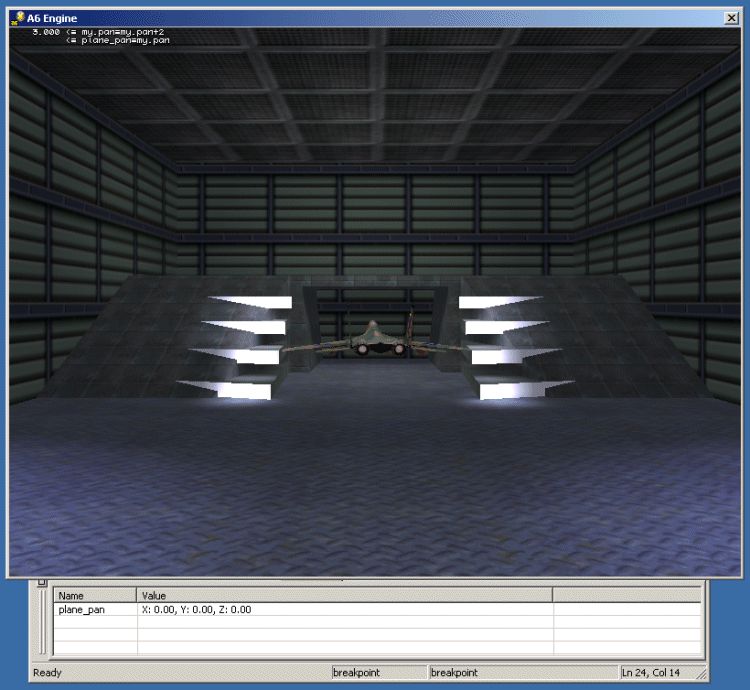 Also in SED this line in the script is now highlighted, indicating the current instruction. Pressing the Single Step key causes the debugger to execute the code line by line, and to display the result of the operation on the left side in the engine window. It is obvious that the plane has a pan angle of 3 degrees, so its initial pan value must have been 1 degree. The watch displays zero at the moment because the line of code that sets plane_pan = my.pan hasn't been executed yet. Let's press Single Step again!