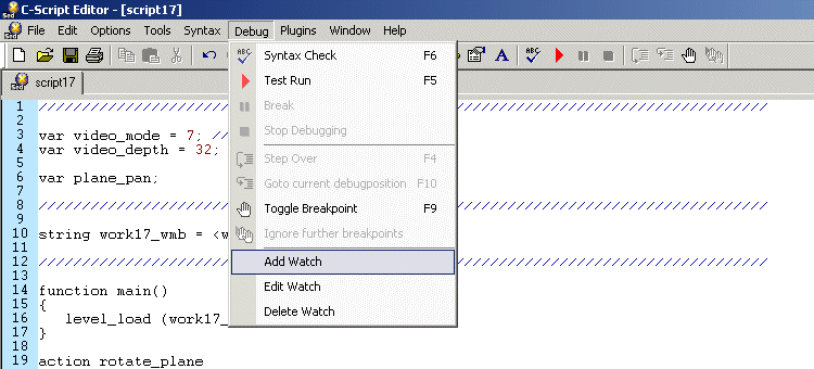 I have added a breakpoint to the script file. The engine will stop every time it encounters a breakpoint in debug mode, and the debugger will be activated for single stepping through our script. Please be patient, you'll see what "single stepping" means pretty soon. By the way, besides entering a breakpoint in SED you can also type "breakpoint;" in the script before the line you want the engine to stop at. This will place a permanent breakpoint into the code.