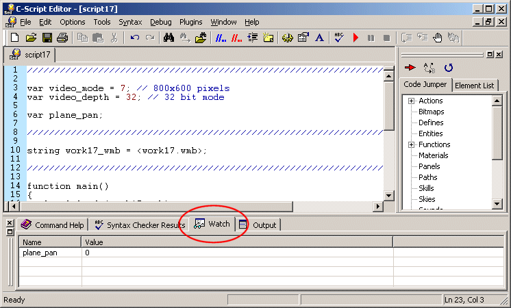We have used a similar script in the 10th workshop, but I have made a few small changes to the code. I have set the ambient of the plane to 100 and I have defined a variable (plane_pan) that has the same value with the plane's pan angle all the time. Why did I do that? Well, I want to "watch" the pan angle of the plane, and with SED versions prior to 6.50 we could only "watch" variables or vectors, not my.pan or other entity related stuff. SED versions 6.50 and above (you can recognize them from the two black and red Run buttons) can watch entities directly and we'll practice that later. Read the previous workshop to get more information about watches if you haven't done that already.
