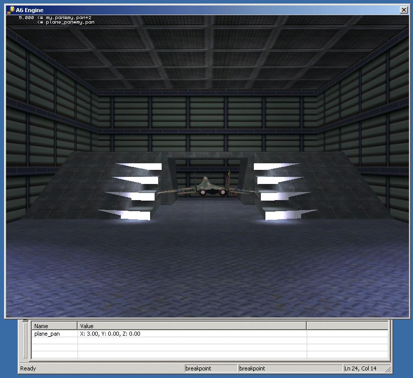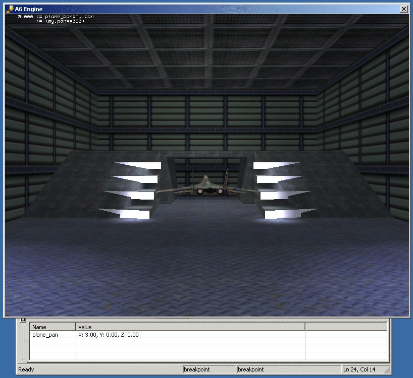 The plane rotates as expected, but the engine doesn't shut down after a complete rotation; in fact, it doesn't shut down at all! What could be wrong with these few lines of script? Press the Esc key to exit the program and let's "watch" the variable named plane_pan.