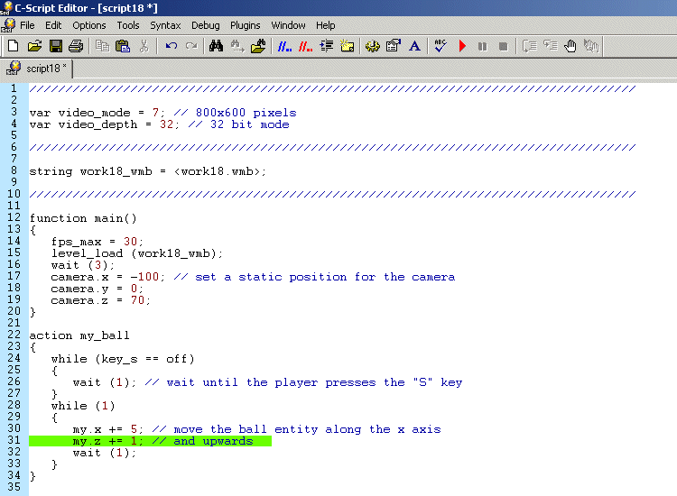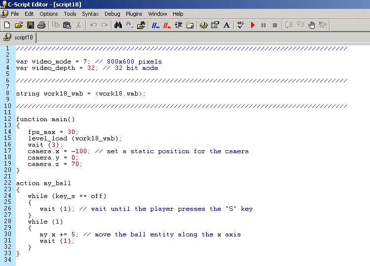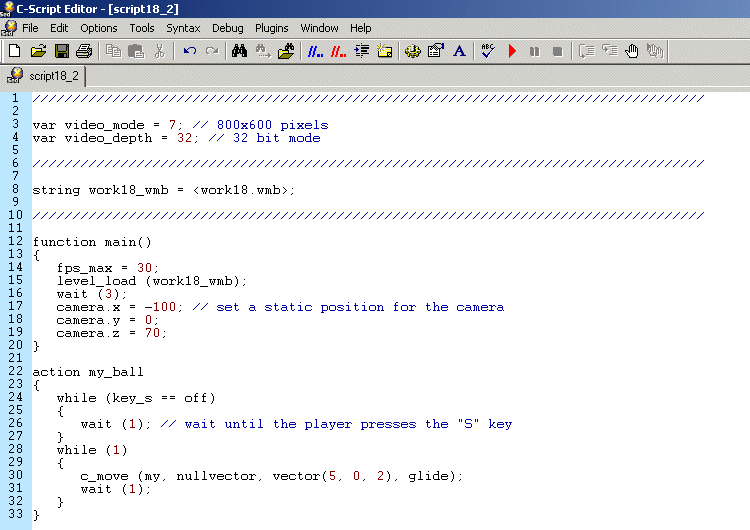 If you think that the code that does all these exciting things is complicated, you are wrong. Here's the modified script18_2 file that moves the ball using c_move: