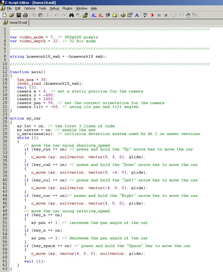 I know that this script looks pretty big, but it contains simple instruction and many comments. I have set good initial position and angles for the camera in main and the rest of the lines move the car using absolute_speed (lines 29 to 44) and relative_speed (lines 46 to 57). If you don't like my camera position you can press the "Zero" key on your keyboard to free the camera and move it where you want it.