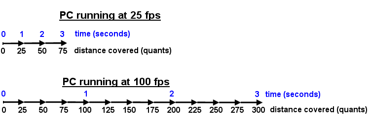 My PC is ancient and gets only 25 fps, while your new PC delivers 100 fps. This means that the while loop above runs 25 times a second on my computer and 100 times a second on your computer. In other words, my PC adds 25 quants (1 quant every frame) to the x coordinate of the entity every second, while your PC adds 100 quants (1 quant every frame) to the x coordinate of the entity every second. Take a look at the picture below to see the distances covered on both PCs over the same interval of 3 seconds: