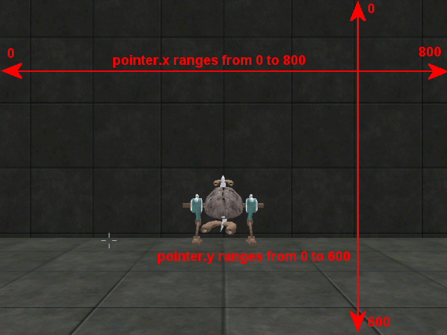 The formula that computes the tilt angle is a bit different because the y coordinate is reverted (see the picture above) so we must subtract pointer.x from 300 in order to get a value that ranges from -300 (bottom of the screen) to +300 (top of the screen). The result is divided by 10, so the tilt angle will range from -30 to +30 degrees if the player moves the mouse along the y axis.