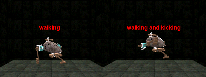 Let's discuss about poses now. A pose is a state that describes the position and the angles of the bones for a certain entity. Any model can have up to 4 different poses; this means that up to 4 different bone animations can be blended at the same time, like running + shooting + turning head + throwing a grenade. We have to use poses if we want to blend two or more animations that change the same bones. We are going to blend 2 animations in the following demo: walking and kicking.