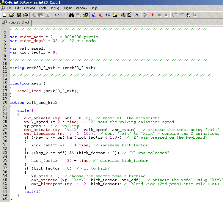 The last "ent_blendpose" instruction blends the two animations nicely because kick_factor, which is set as "blending_factor" here, increases and decreases its values smoothly (see the picture in the 22nd workshop). By blending the second pose ("kick") into the first pose ("walk") we can be sure that our models won't show sudden changes (but smooth animation) when combining their existing bone animations.