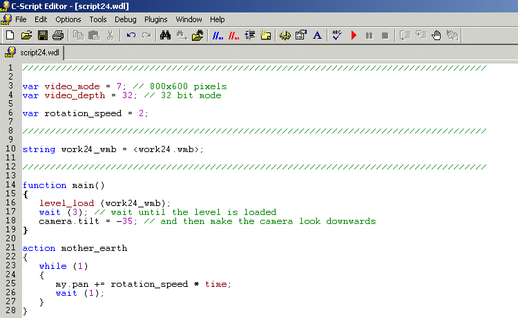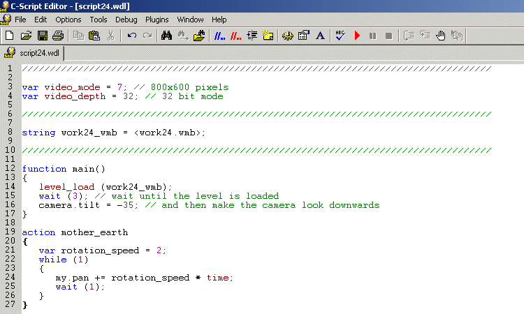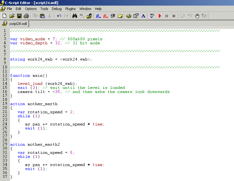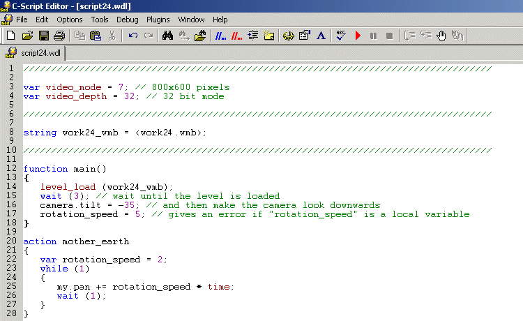 Fear not, for you have used global variables all this time without even knowing it. I needed to explain actions and functions first, because we need them in order to understand how local variables work. Let's fire up an example; start WED, load work23.wmp and run it using script23.wdl: