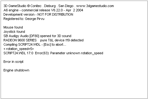 This time the rotation speed hasn't changed at all! The console function doesn't know the variable, because "rotation_speed" is now a local variable, so it is known only inside the action named "mother_earth". If I would put a line that sets a new "rotation_speed" value inside function "main":