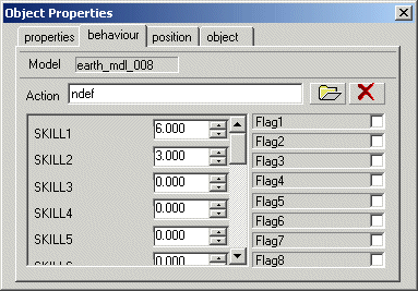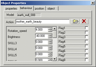 How do we redefine the skill names in WED? Start WED, load the work24_2.wmp file, build it and run it using the script24_2.wdl file; you will see the same rotating planet, only a bit darker. Select the planet model, choose "Object Properties" and then click the "behaviour" tab: