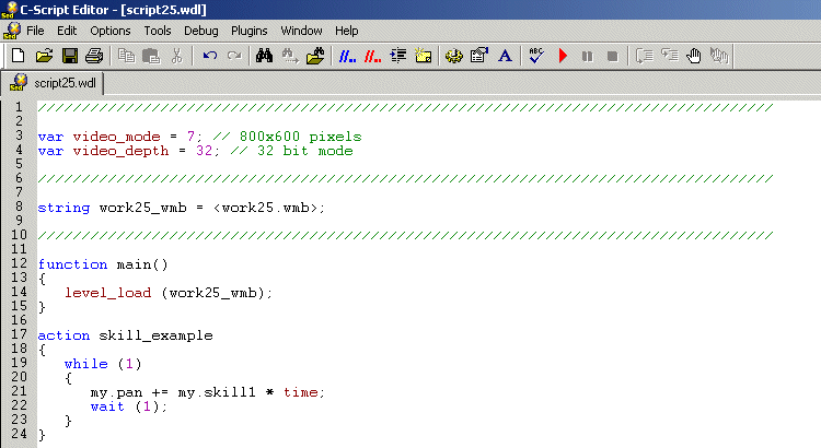 I have set SKILL1 to 6 and SKILL2 to 3, but this won't have an impact on the entity unless I read these values using some C-Script code. So what are we waiting for? Start SED and open the script24.wdl file: