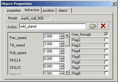 Now here's your homework: create an action that "uses" the first three skills in WED, named "Pan_speed", "Tilt_speed" and "Roll_speed" to control the rotation speed of the planet by changing its pan, tilt and roll angles inside a "while(1)" loop. The same action must use its first flag, named "Transparency", to control the transparency of the planet model.