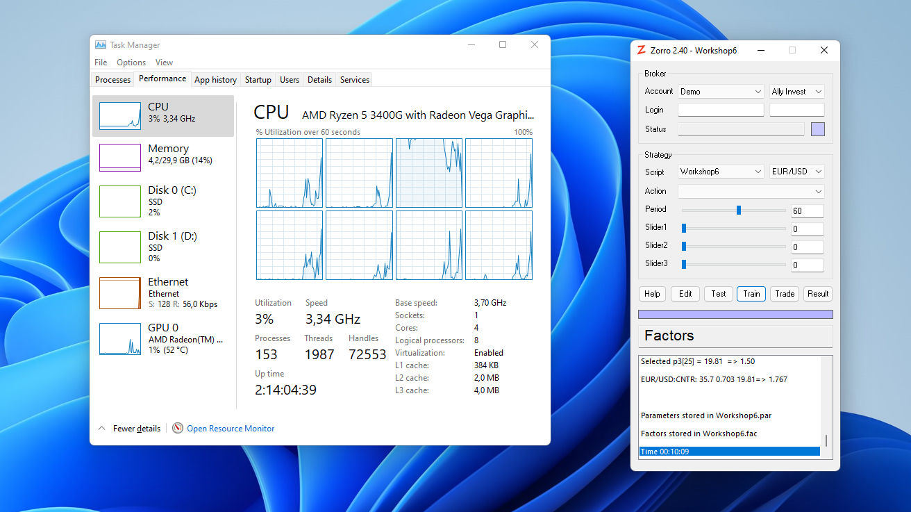 After installing a fresh copy of Zorro Beta 2.42, my CPU finished the task after half the time. When I looked into the history folder I found, that only EURUSD Data is available. So the script just skipped the USDJPY optimization run. Maybe this wasn't a clever Idea to use Workshop6 as a benchmark.