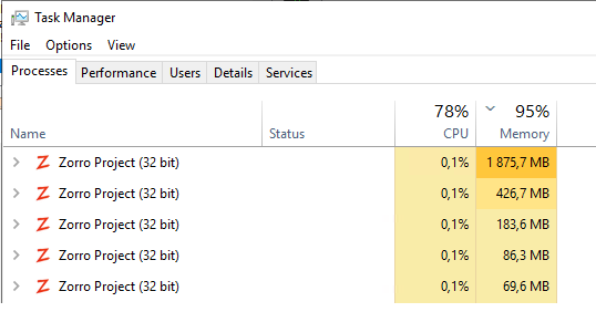 I started to use multiple Zorro S instances (2.44). As you see on the attached picture this is my VPS's task manager, and my question is about the huge memory usage. The running script is exactly the same on all Zorro instances: they connect to a MT4 terminal (one MT4, one chart open with the Zorro EA.). They are in Trade mode.