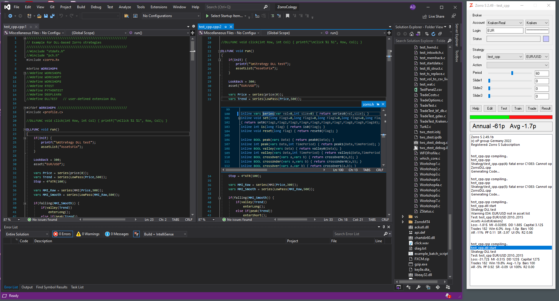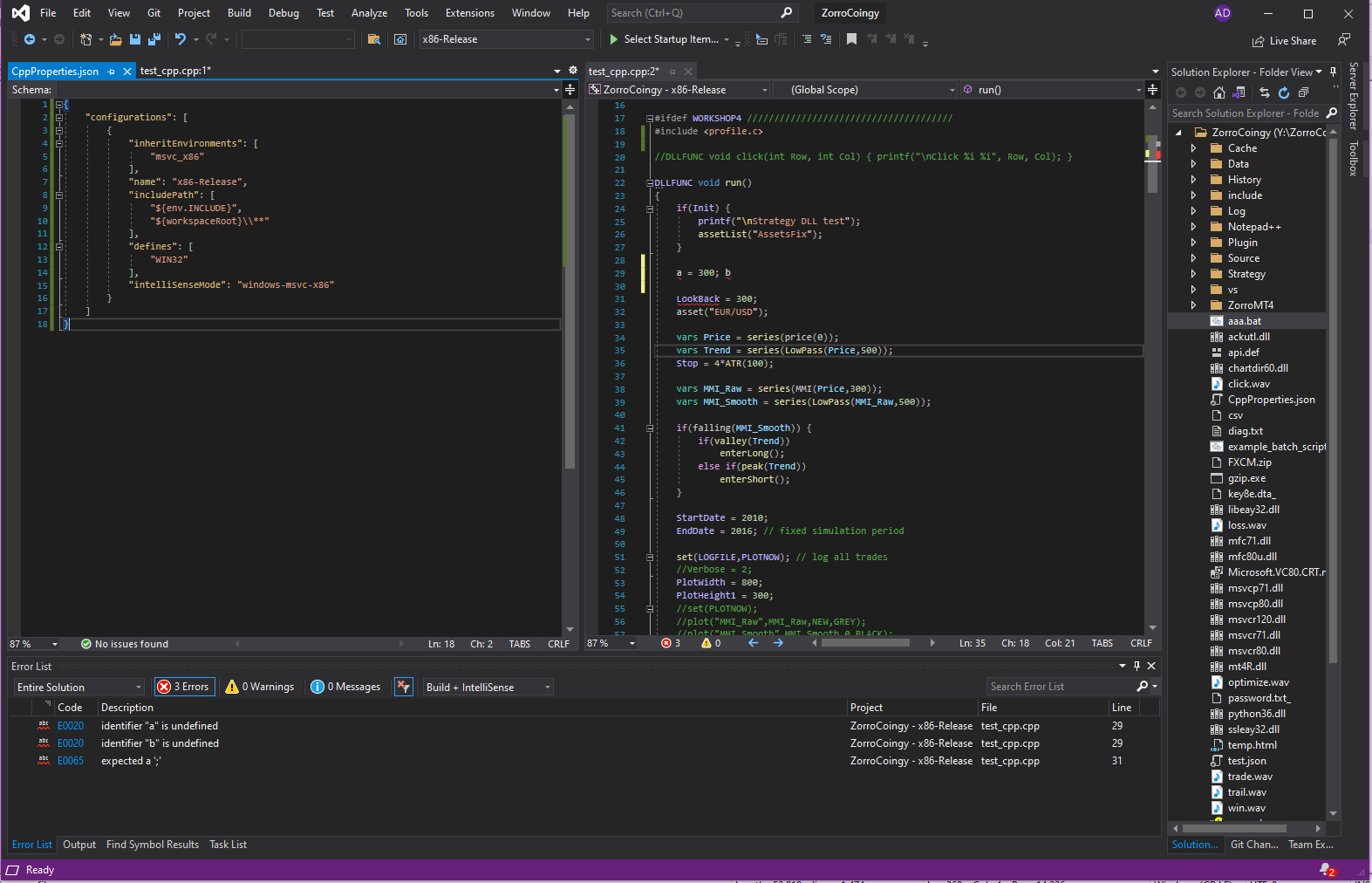 I might consider using Visual Studio directly to edit C++ files, even if in the Strategy folder. The intellisense works very well if you simply open up the Zorro Folder, and then from there open strategy files in subfolders. This might even be the best default behavior, to open a C++ file in Visual Studio from the Zorro folder root.