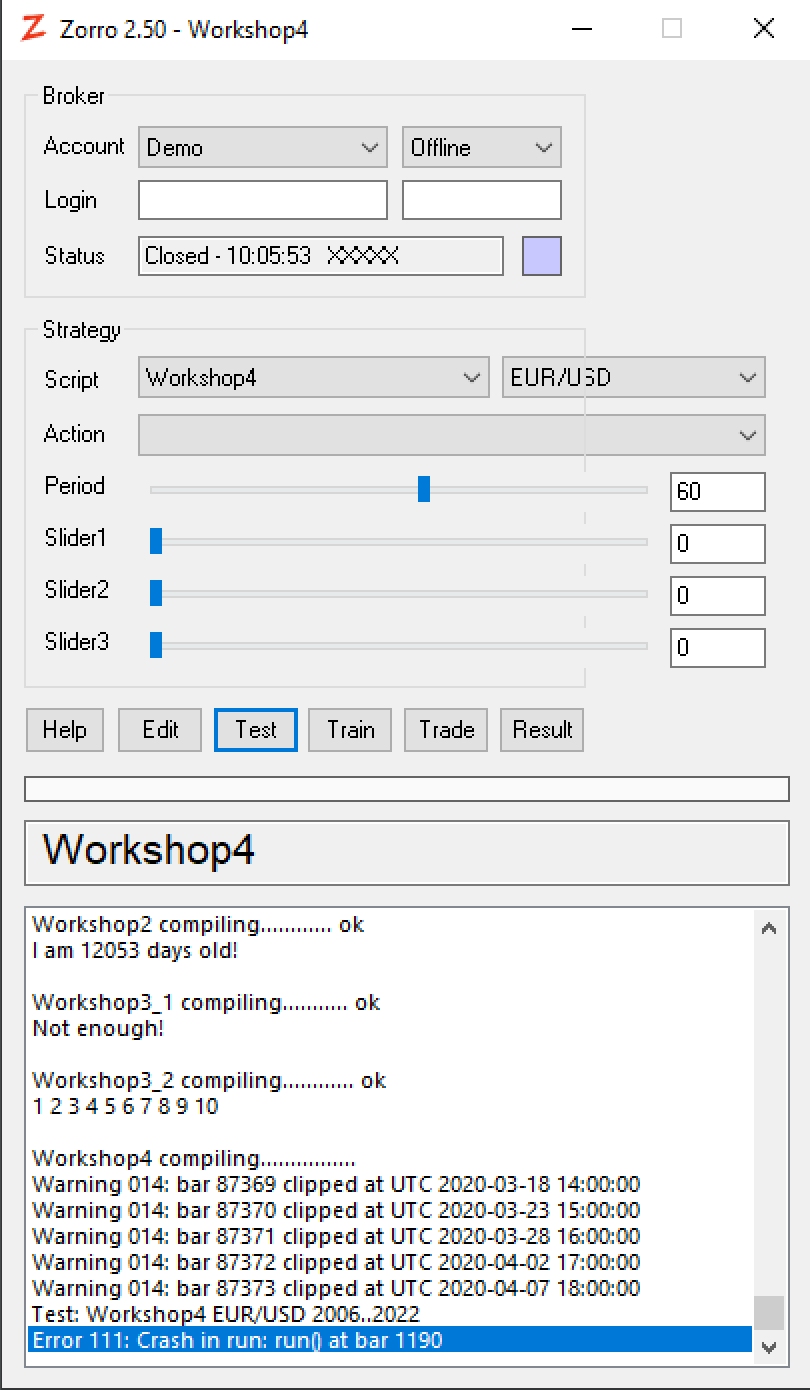 Deleting and reinstalling Zorro fixed the problem. However, when I installed more historical data (required for workshop 5) it crashed again with error 111. I removed the historical data and tried other historical data files until I found a combination that worked. Data files were downloaded here