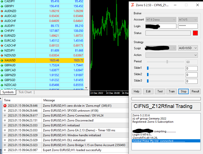 Then closed MT4 and restarted it. Then I tried to connect again and got the error as seen below. Also, Zorro could't connect.