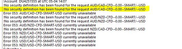 See the attached photos of the error and asset list I am currently using trying to load the FX CFD's. Note for example if I use AUD/CAD or AUD.CAD in the symbol section of the asset file it loads the cash contract without any problems.