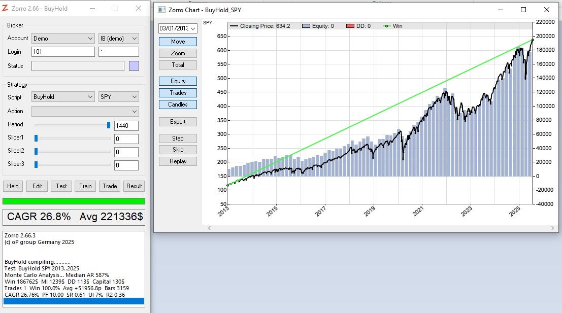 But i can not understand how if SPY went from 117 to 637 , and how just Buy and hold can lead you from 10k to 195k, because in the BuyHold.c i cant see leverage.