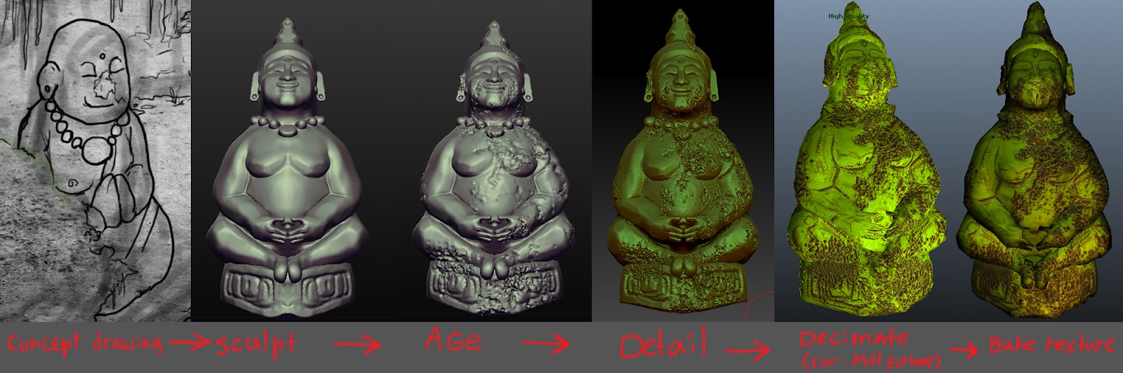 Still working on the hidden ancient shrine level concept and transforming it into 3D heres an example of the steps i take when converting a high poly model to a game ready.