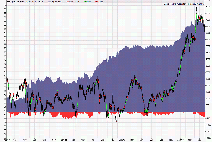 Walk-Forward Test: dt-demo5 portfolio 2008..2013 Read dt-demo5.fac dt-demo5_1.par dt-demo5_2.par dt-demo5_3.par dt-demo5_4.par Profit 5706$ MI 140$ DD 617$ Capital 986$ Trades 1397 Win 32% Avg +402.9p Bars 150 CAGR 75% PF 1.41 SR 1.67 UI 4.8% Error 19% Time 00:02:58