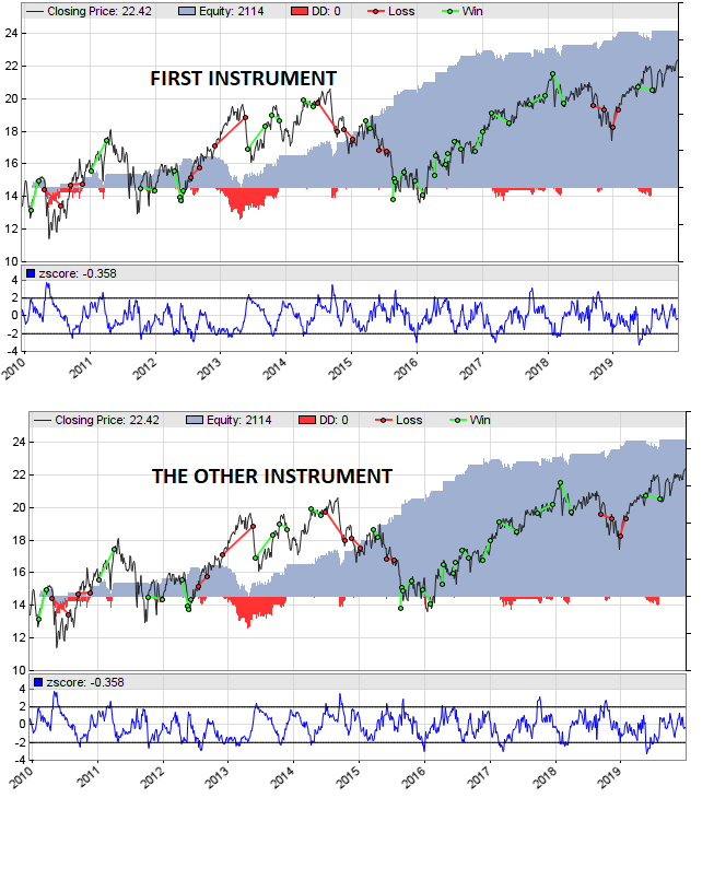Here's the code. I have also attached a screenshot of what I would like to see... Showing the subplots is not necessary, I just want to have both instruments showing their respective trades.