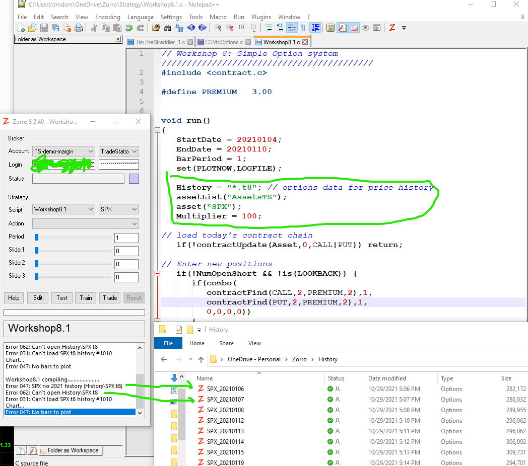 I'm trying to alter presumably quite an old script that is also in the Blackbook for options trading and also trying to figure out how to change this simple script to trade a much shorter time frame using some 1 minute options data I have. How should the identifier/pointer for the SPX history be formatted in this case and error in the script? My simple thinking was that Zorro should be able to see "*.t8" files and then the Asset pointer being SPX it should see the files (hopefully should also see the screenshot attached):