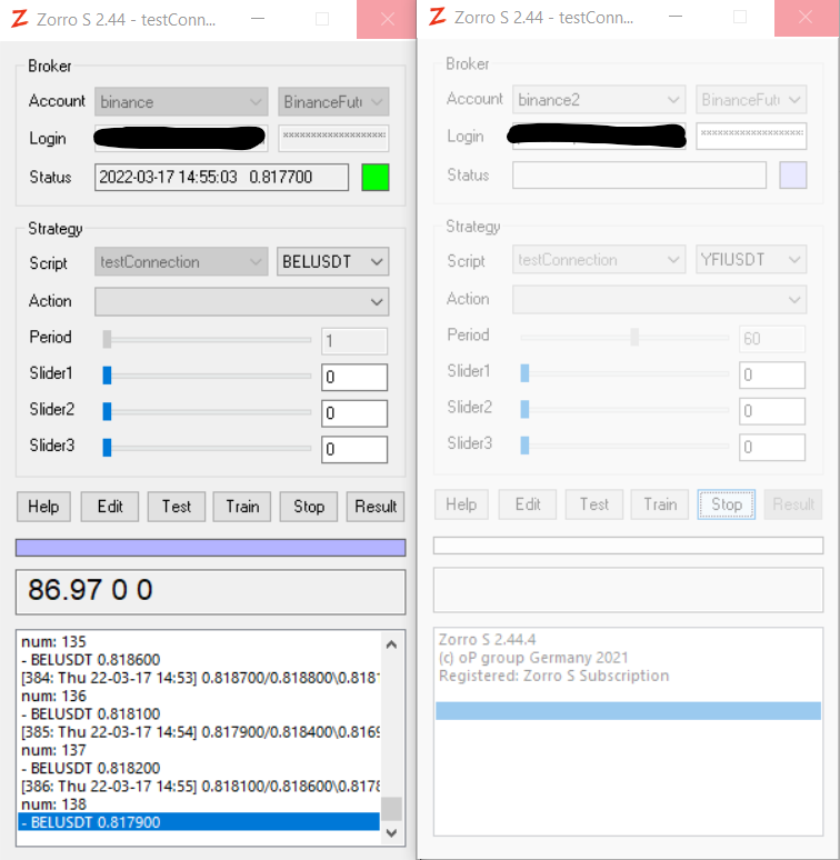 I want to use multiple Zorro instances on Binance Futures. The first one is works nice, but when I start Trading on the second one, all of the Zorro instances freezes. To be more precise, it slows incredibly down: if I just want to drag'n'drop the Zorro window, it responds in ~30 seconds.