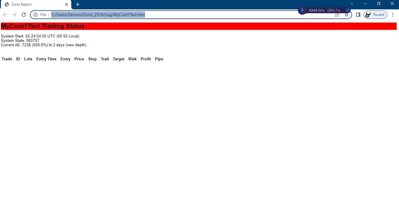 (1) The ".htm" report is used only in the trade mode, i.e. when your Zorro instance is connected to either real or demo brokerage account. It tracks your system's equity curve, lists active trades and collects trading statistics similar to the perofrmance report. You can make the page visible to the web and check it with your smartphone anytime. This is the whole idea.