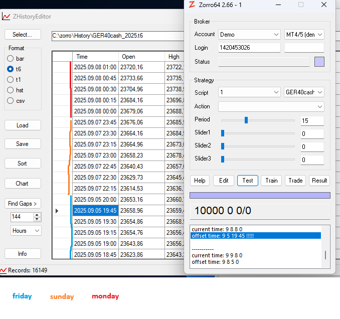 • Surprisingly there is a trading day between monday and friday: sunday evening (orange zone), just a few bars. (Of course it's not that big surprise, it's because of the timezone shift.)