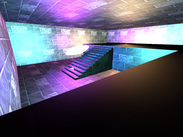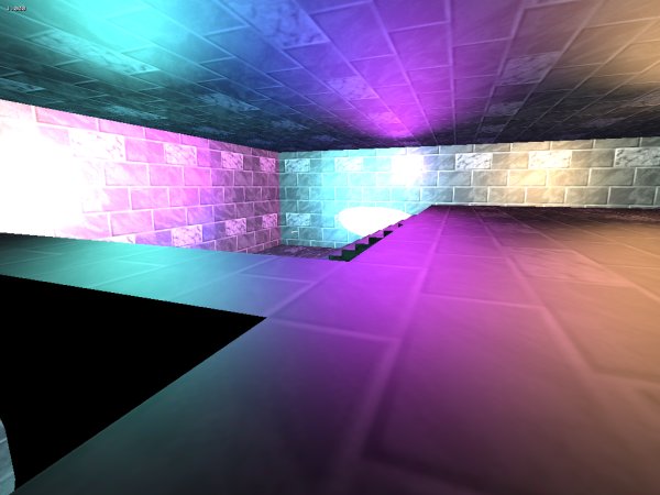 here are two shots. it's applied to mat_shaded and reduced to accept 4 dynamic lights (faster!). note that the level texture is on TEXCOORD1, not on TEXCOORD0 (shadowmap).   notice the perfectly smooth specular cones and the hard edges (due to a phong algorithm). greetings, joey. edit: next thing to do would be to adapt the lighting to attenuation. that's no problem though.