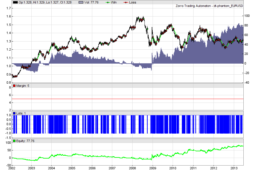 What I'm currently investigating is how to tune your checkEquity function to do that for me, automatically. With some very large values for fast & slow (900/1200) I've managed to make it at least stop trading when it detects that strategy started losing, and keep accumulated profits. That's promising! But, thanks to very long periods, it's also rather late in reaction, so some profits are given back and that is the main problem. I'll see if it can be tuned and made to react faster, and also to do the direction change instead of tweaking Margin. Who'd say, so short scripts, and so many details behind. Zorro encourages very condensed code, and that's good, IMHO.