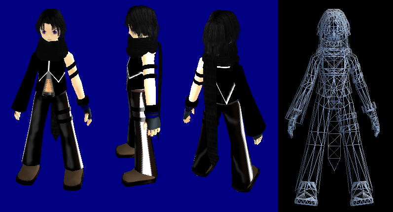 JulzMighty - heh, its supposed to look unplanned, like he jsut woke up, but not anime style or something. It's a really bad angle for the pic, but theres heavy volume in the back and sides so the top is a bit more flat. Each side of head has 4 rows of 6 poly flats, and all except the bangs edges are almost perpendicular to the head for volume.